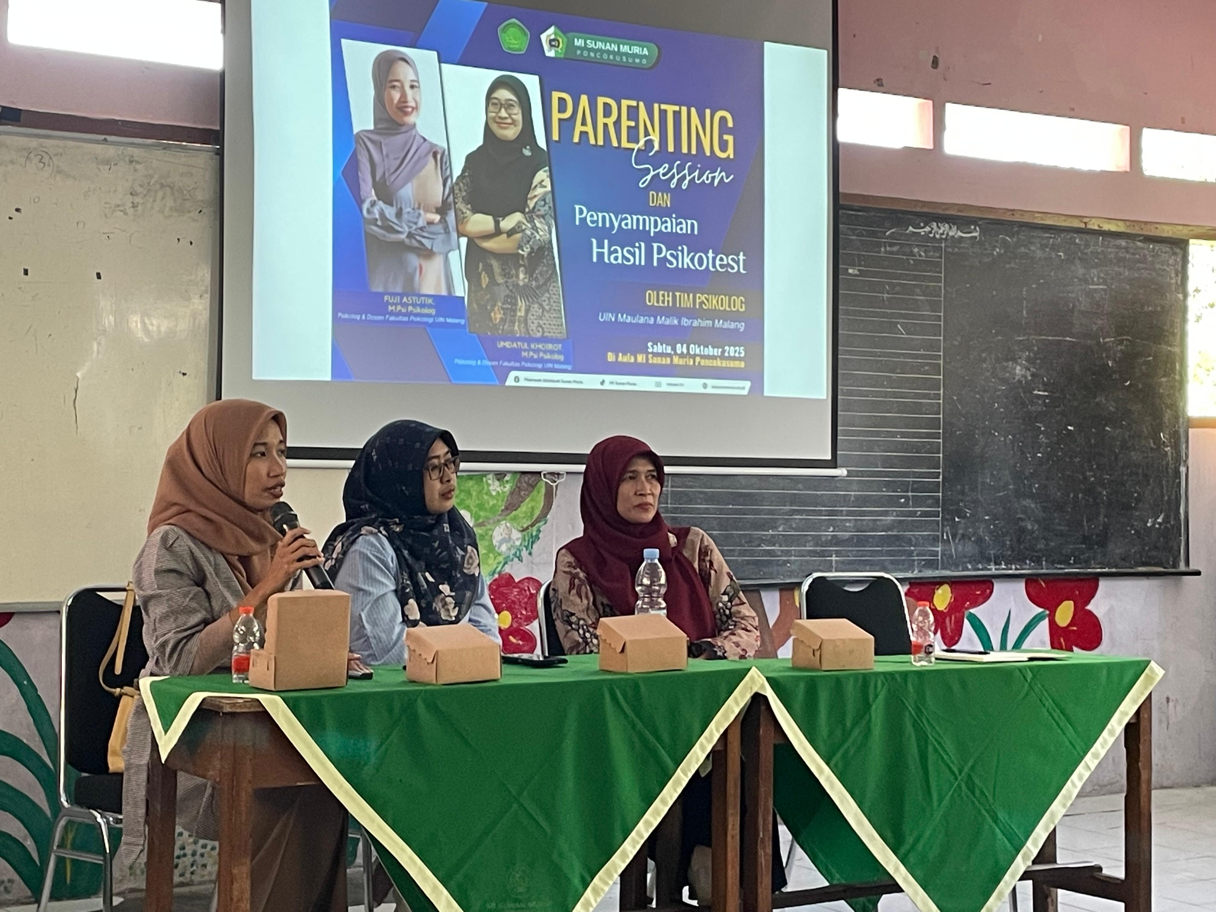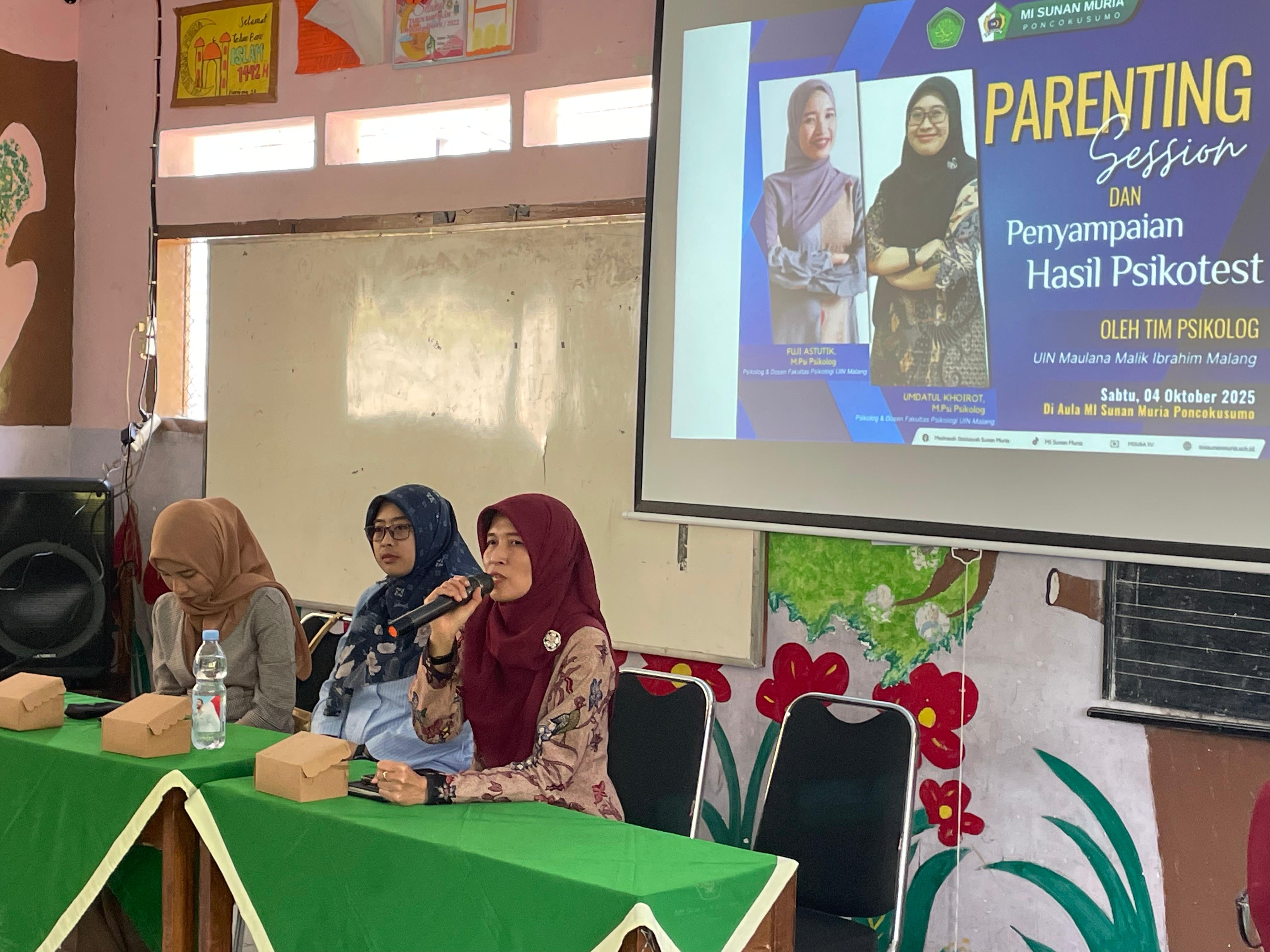 Dalam rangka mendukung tumbuh kembang siswa secara optimal, MI Sunan Muria melaksanakan kegiatan Parenting Session dan Penyampaian Hasil Psikotes bagi wali murid kelas 1. Kegiatan ini diselenggarakan di lingkungan madrasah dengan menghadirkan dua narasumber dari Fakultas Psikologi UIN Maulana Malik Ibrahim Malang, yakni Ibu Umdatul Khoirot, M.Psi. dan Ibu Fuji Astutik, M.Psi.